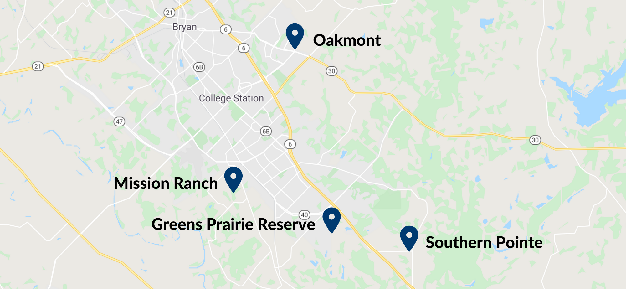 Tucked away in Bryan, you would never know you are only 15 minutes away from the largest university in Texas. Oakmont offers miles of scenic nature trails to explore, nearly nine acres of parks, and green spaces for picnics with family and playtime with friends and neighbors. Click below to view available listings!